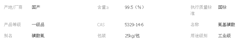 性 質(zhì):白色正交晶體;不揮發(fā)、不吸潮、無味無臭;常溫時很穩(wěn)定,能保持?jǐn)?shù)年不變;易溶于水和液氨,在水溶液中呈強(qiáng)酸性;微溶于甲醇;不溶于乙醇和乙醚。具有氨基和磺酸基雙官能團(tuán),能和多種物質(zhì)進(jìn)行化學(xué)反應(yīng)。熔點205℃,分解溫度209℃。