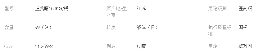 特 性:正戊腈又稱戊腈、正丁基氰、正戊腈、丁基氰、氰化丁烷,是一種無色液體,是由溴丁烷與氰化鈉制得。主要用作有機(jī)合成原料,還用作萃取劑從苯和環(huán)已烷中萃取苯。